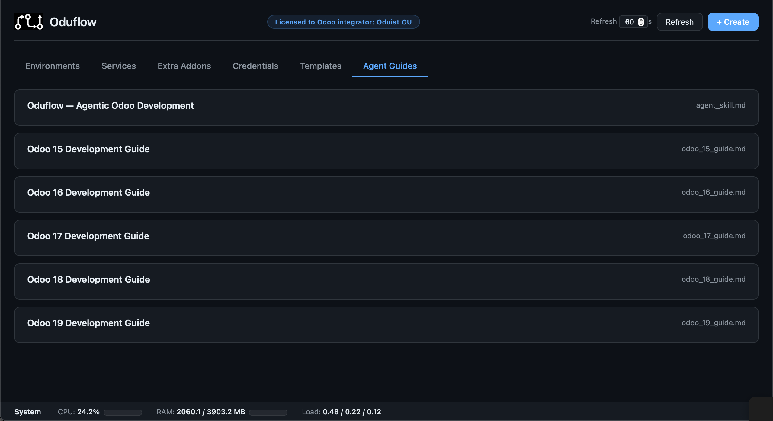 - Environment creation form (branch, repo URL, Odoo image, template, extra addons)